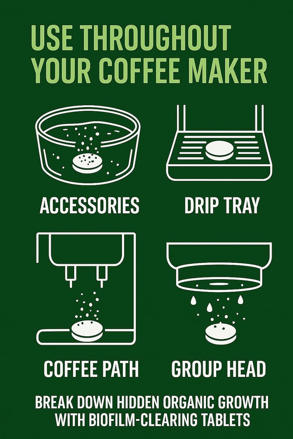 - Targets Hidden Mould & Build-Up – Scientifically formulated to break down organic biofilm, coffee oils, and residue inside coffee machine pipes, nozzles, and tanks.