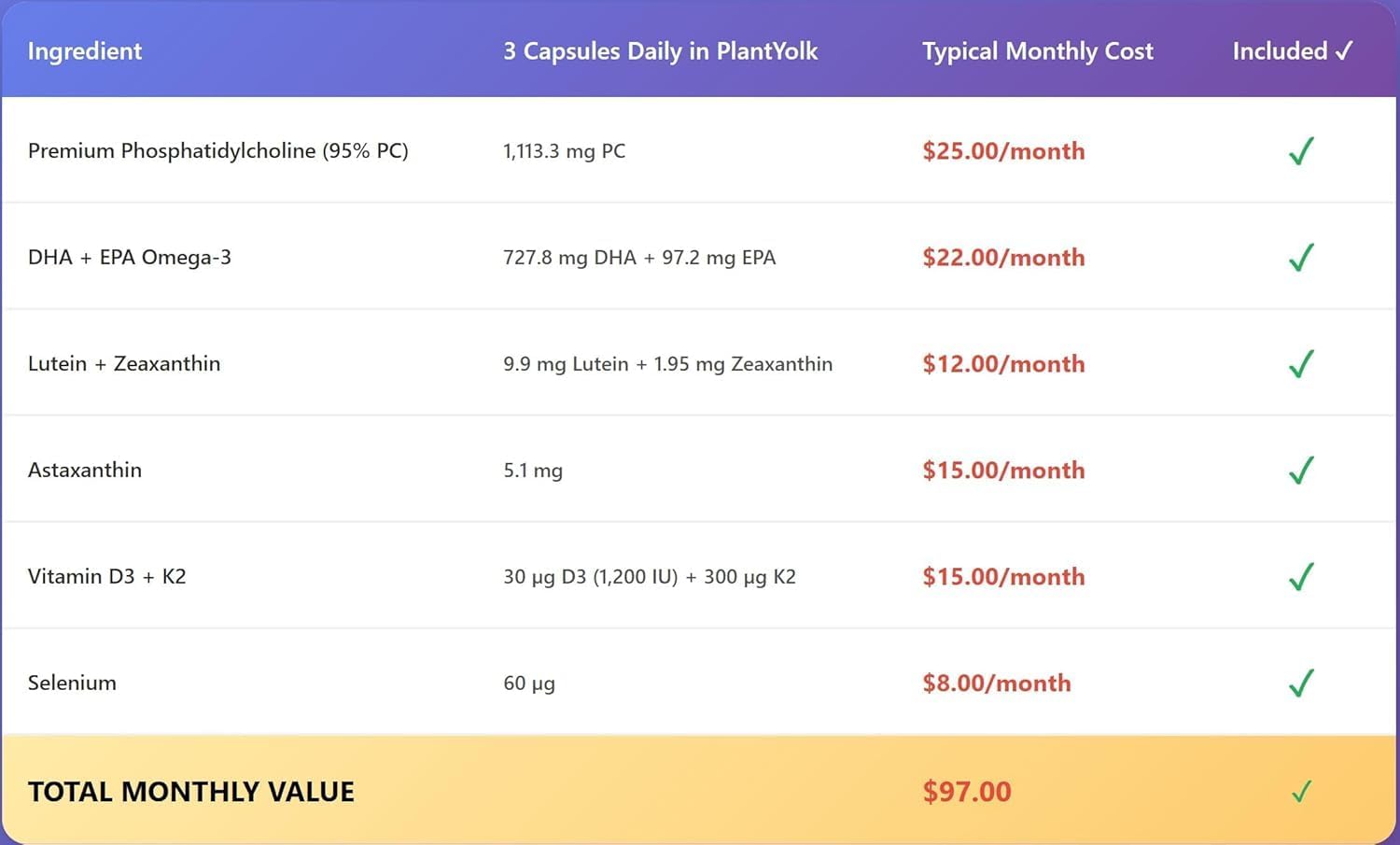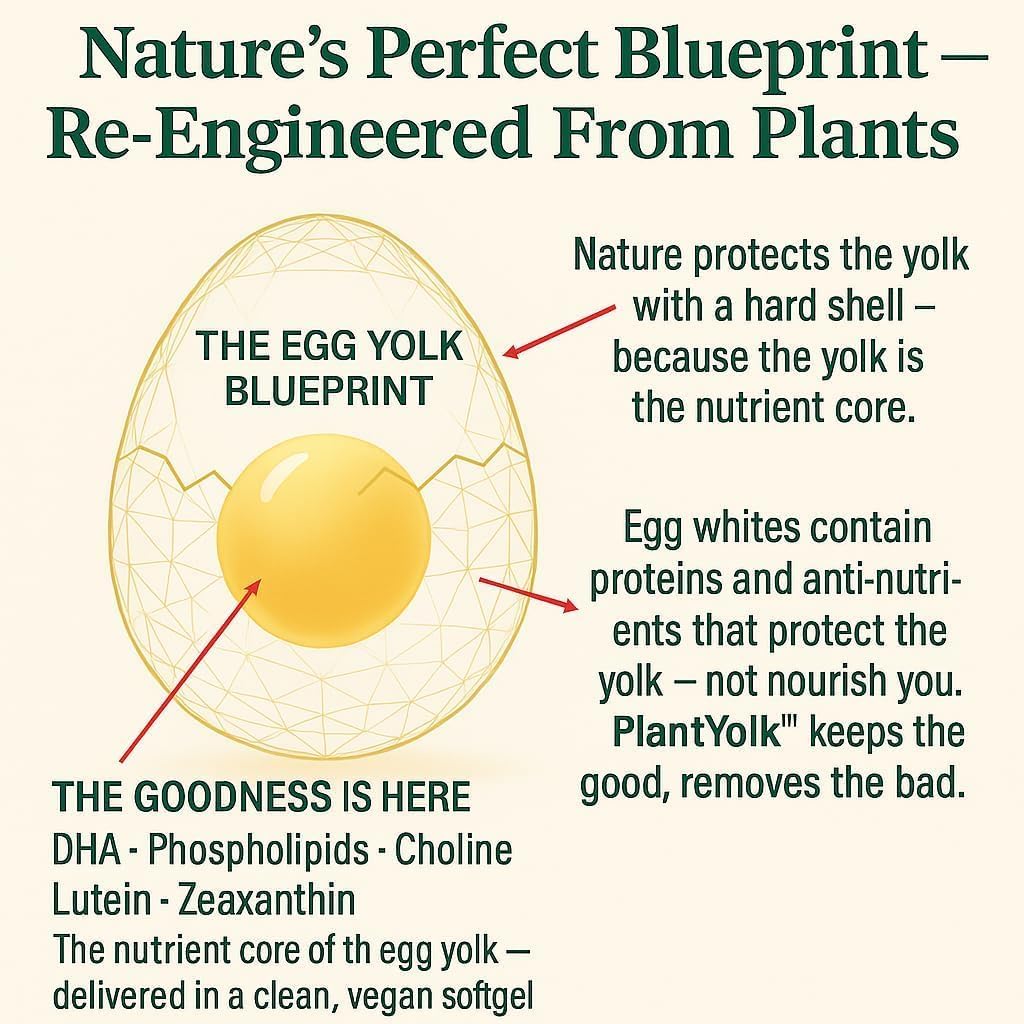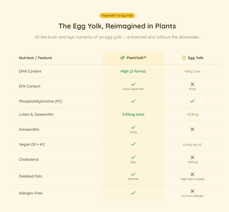 - Your all-in-one solution for the key nutrients missing in a plant-based diet. Plantyolk is a revolutionary formula designed to close the "Yolk Gap", combining Full-Spectrum Algal Omega-3 (EPA/DHA), high-dose Phosphatidylcholine, and the crucial duo of Vegan D3 & K2. Plus, we've included Lutein, Zeaxanthin, and Astaxanthin for powerful screen-time defense. Stop juggling bottles. Start simplifying your wellness with the foundational formula that completes your stack. 120 Capsules / 60-Day Supply (Vegan & Soy-Free K2)